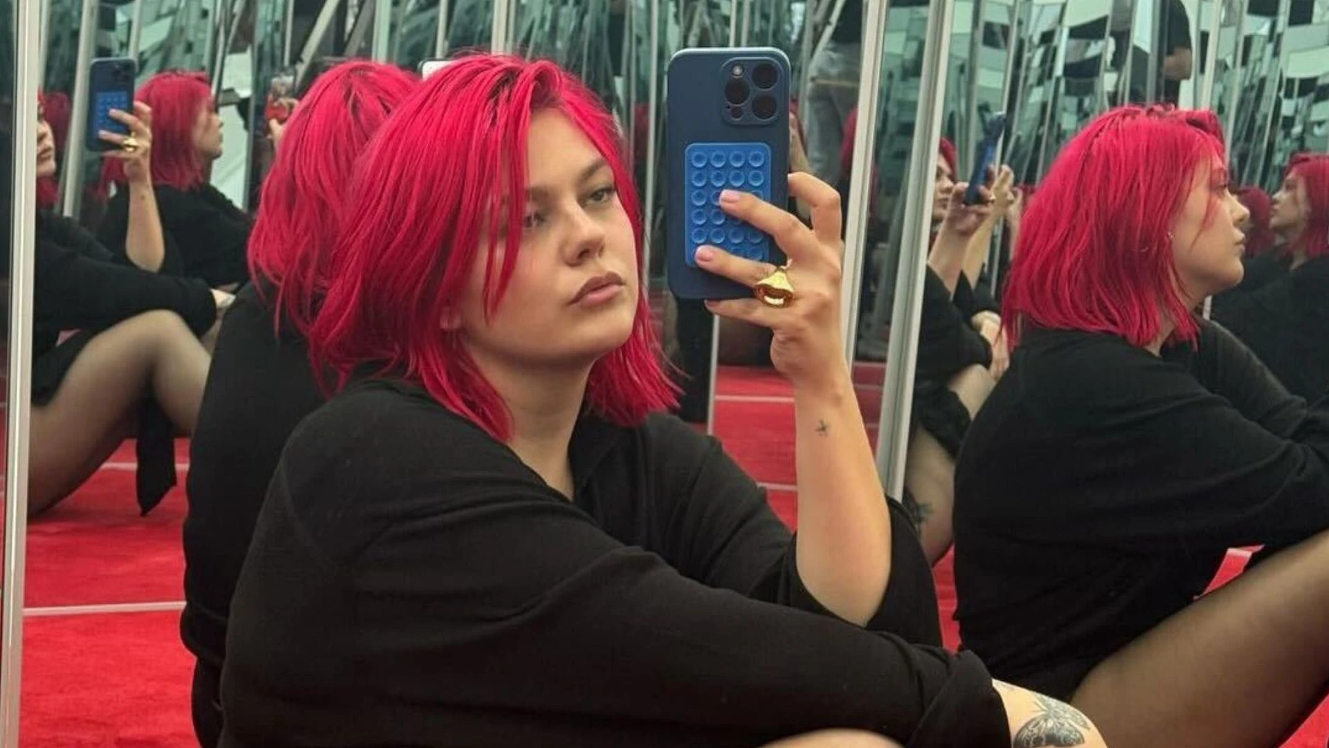 This vibrant shade, as beautiful as it is demanding, did not fail to pose some practical problems. “Having red hair = having red fingers the second you tie your hair (…). I die”, she confided with humor to her subscribers on social networks.