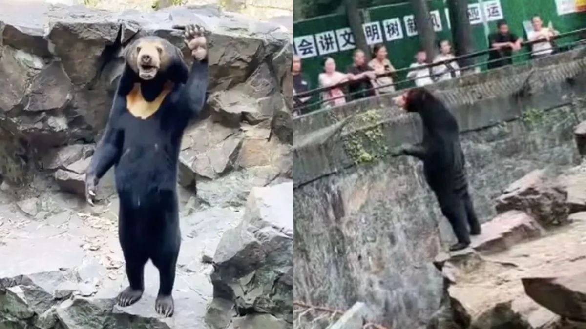 Bear At Hangzhou Zoo Accused Of Being A Human In Disguise Greets Visitors, Sparking Doubts