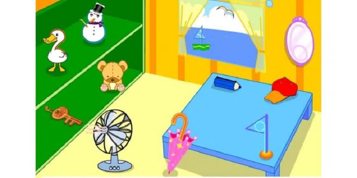 Picture a cozy, toy-filled room — the kind that sparks childhood nostalgia in a second. There’s a warm wooden shelf, a tiny table, and all the charming chaos of a child’s play space: a snowman, a stuffed bear, a golden key, a feathered fan, an umbrella, wall art, a mirror, a baseball cap, a duck, a crayon, a bird, and even a little toy boat.