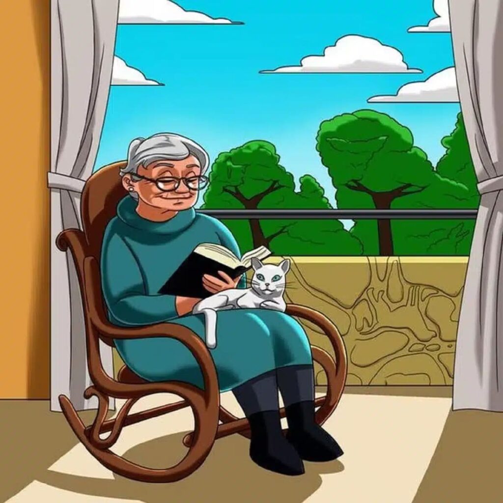 At first glance, the image looks perfectly ordinary. An elderly woman sits peacefully in a rocking chair, basking in the afternoon sun with a book in hand. Her cat is curled up on her lap, and everything feels serene — but there’s a surprise lurking in plain sight.