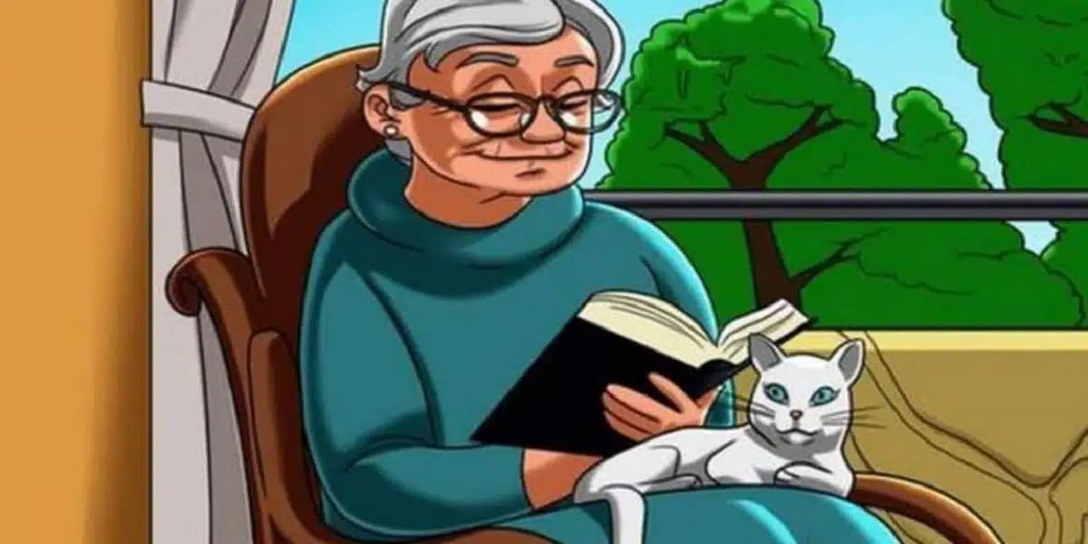 At first glance, the image looks perfectly ordinary. An elderly woman sits peacefully in a rocking chair, basking in the afternoon sun with a book in hand. Her cat is curled up on her lap, and everything feels serene — but there’s a surprise lurking in plain sight.