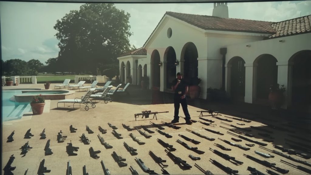 The music video for “What Did I Miss?” features a similar scene to that portrait, showing the Canadian star standing poolside surrounded by several guns.