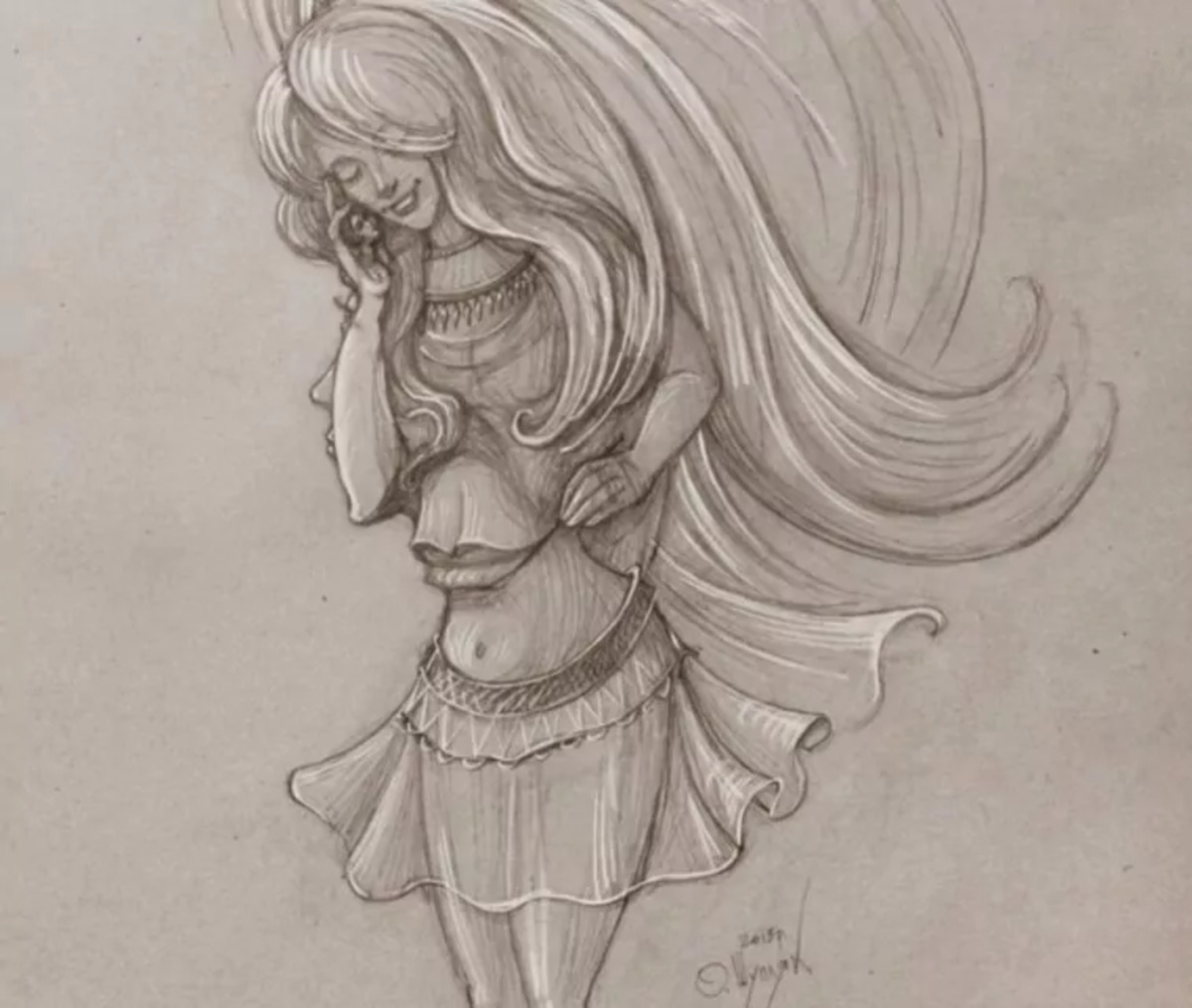 The third woman? She’s even more elusive. Examine the shape of the woman’s arm and you’ll notice features emerge—a side profile formed by the folds, curves, and shadows of the sketch. It’s only visible if you mentally shift your perspective.