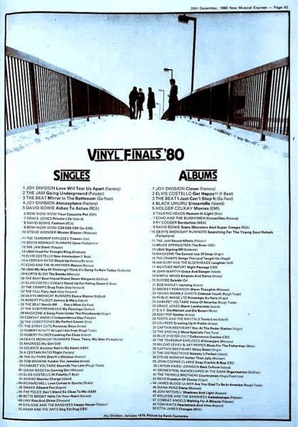 Behind Joy Division in singles: Paul Weller’s The Jam and The Beat, while among the albums at number two Elvis Costello and The Beat.