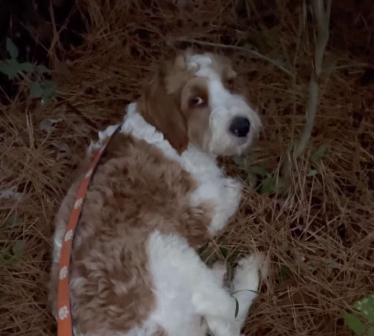 Sometimes the most touching rescue stories come from the heart of nature. In the wooded areas of South Carolina, a young dog named Parker was left behind by a breeder along with several other dogs. Without a proper place to call home, this curly brown-and-white pup resorted to using a pile of pine needles as his bed—a testament to his resilience amid hardship.