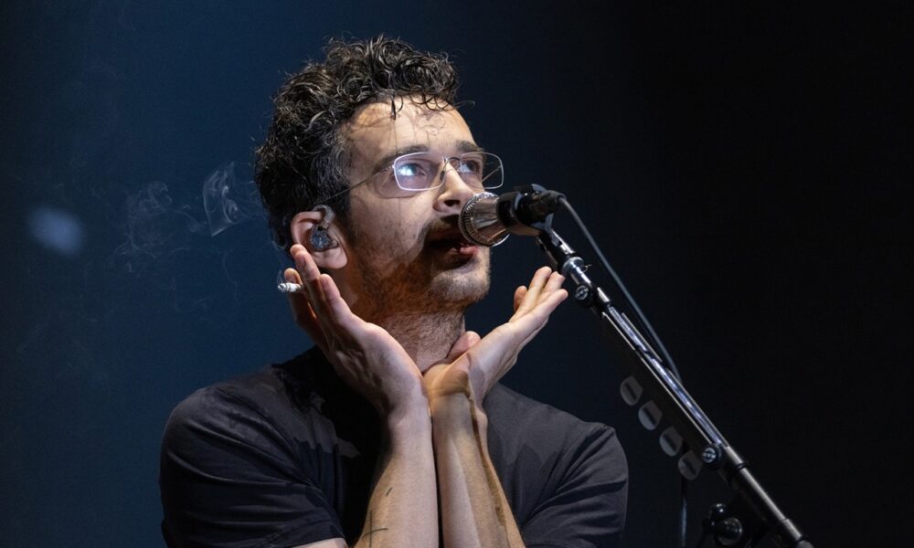 Then Healy, still dressed in a Bateman-style suit, was on stage staring at a wall of nine televisions playing white noise. He then collapsed in fear when someone wearing a mop-style wig came out of one of them, like in the iconic scene from The Ring. The audience screamed in both horror and delight. He then treated fans to a solo acoustic rendition of “ Be My Mistake “.
