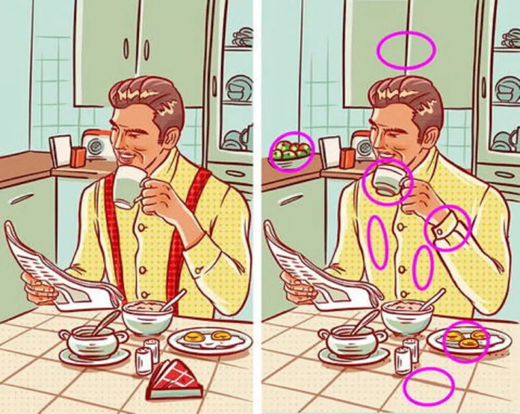 Ready for the answers? The hidden changes were tucked into everyday details: differences in the kitchen cupboards, the table design, the man’s arm position, and even small tweaks in his clothing. Some people breeze through these puzzles in seconds, while others miss one or two no matter how hard they look.
