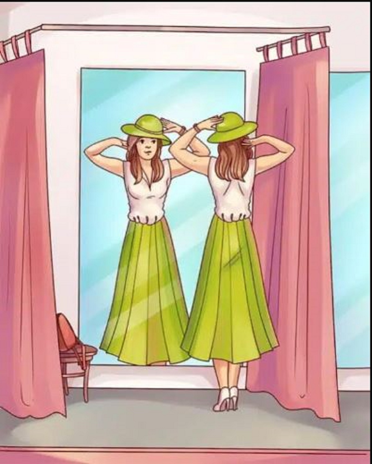 The devil’s in the details, and this time, it’s the woman’s wristwatch that’s the culprit. You see, in reality, a mirror is supposed to reflect objects without flipping left and right, or top and bottom. Thus, the watch should appear on the left hand in the reflection, not on the opposite side.